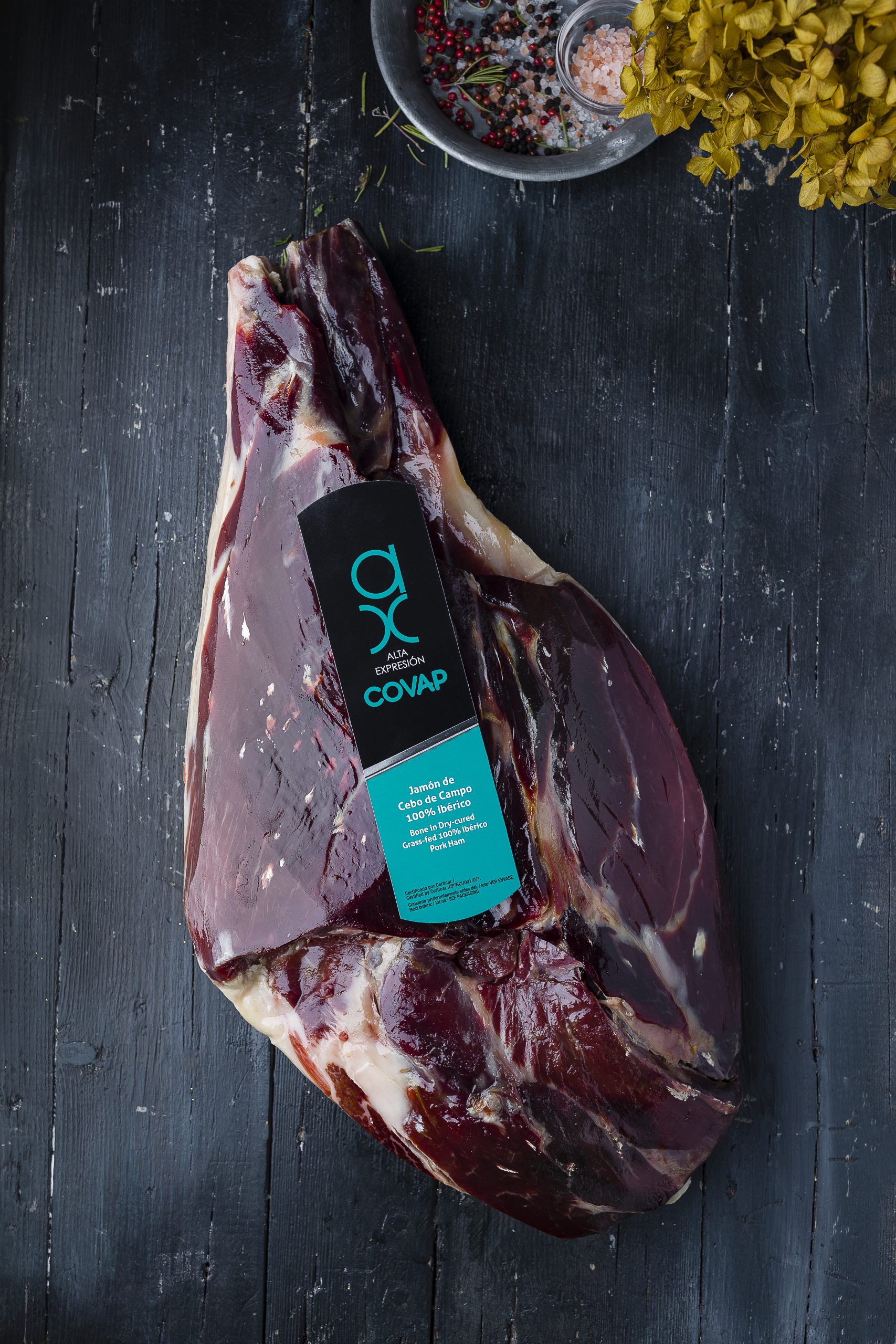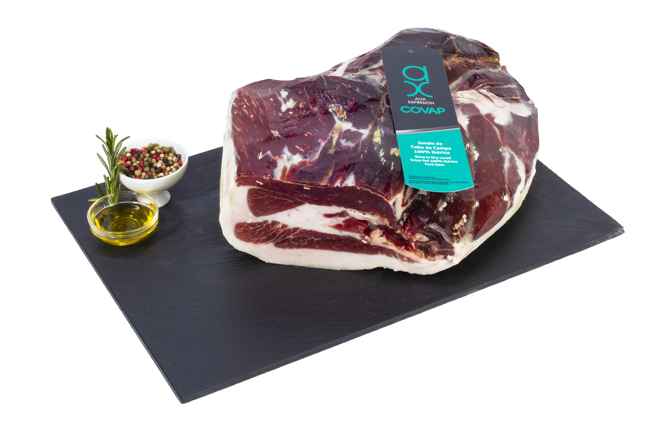 Grass-Fed 100% Iberian ham from free range pigs is obtained from pigs that have been fed with natural feed, grass, acorns, roots and natural/aromatic herbs.